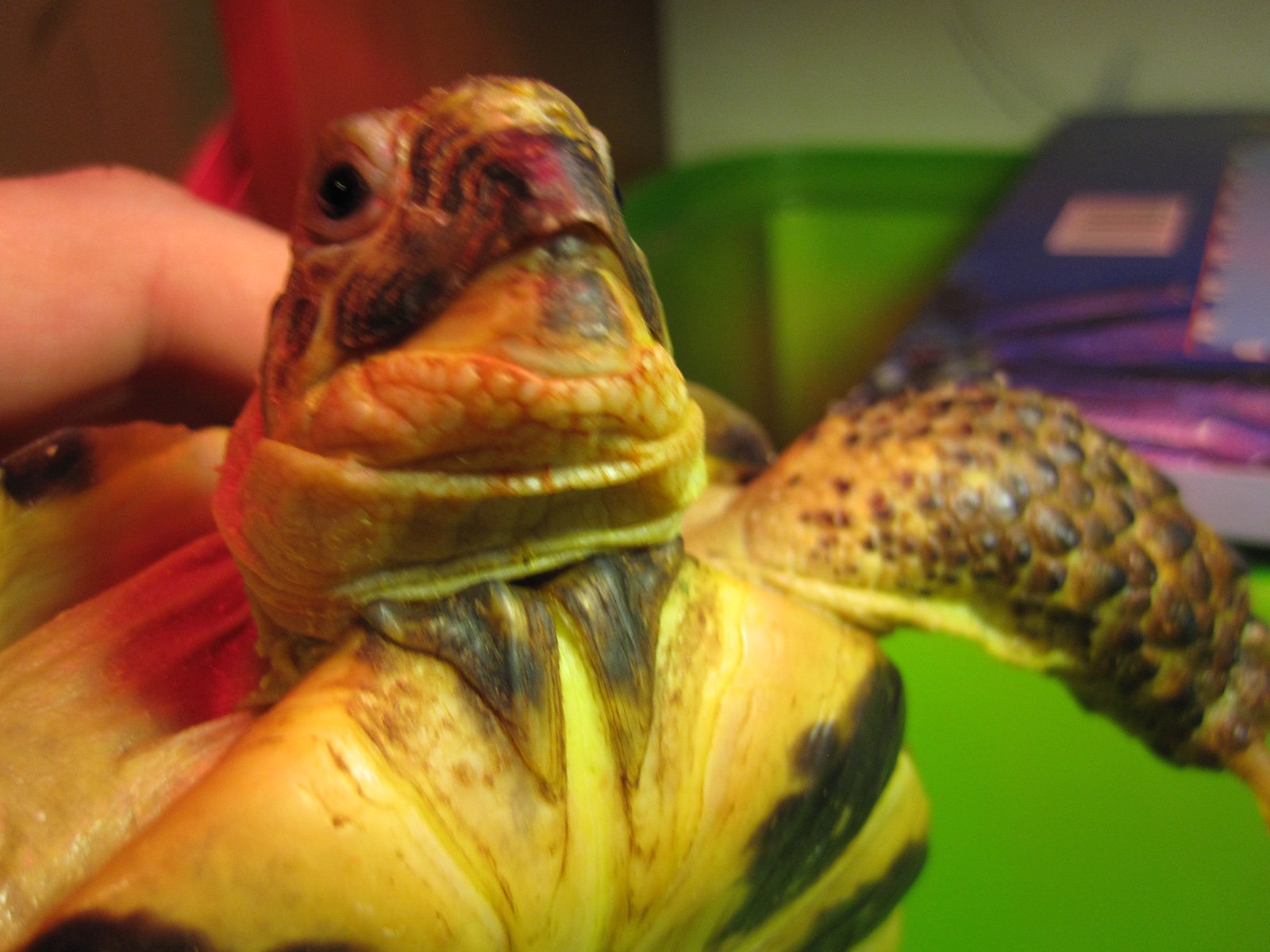 Террариум самодельный, не на сквозняке. Над головой у нее Repti Glo 150 (10-12 часов в сутки) и Heat Glo 75W (почти круглосуточно) от Exo Terra. Под лапами опилки и сено. Раньше были древесные гранулы, но начала их есть, убрали и стали иногда подсыпать в еду клетчатку.