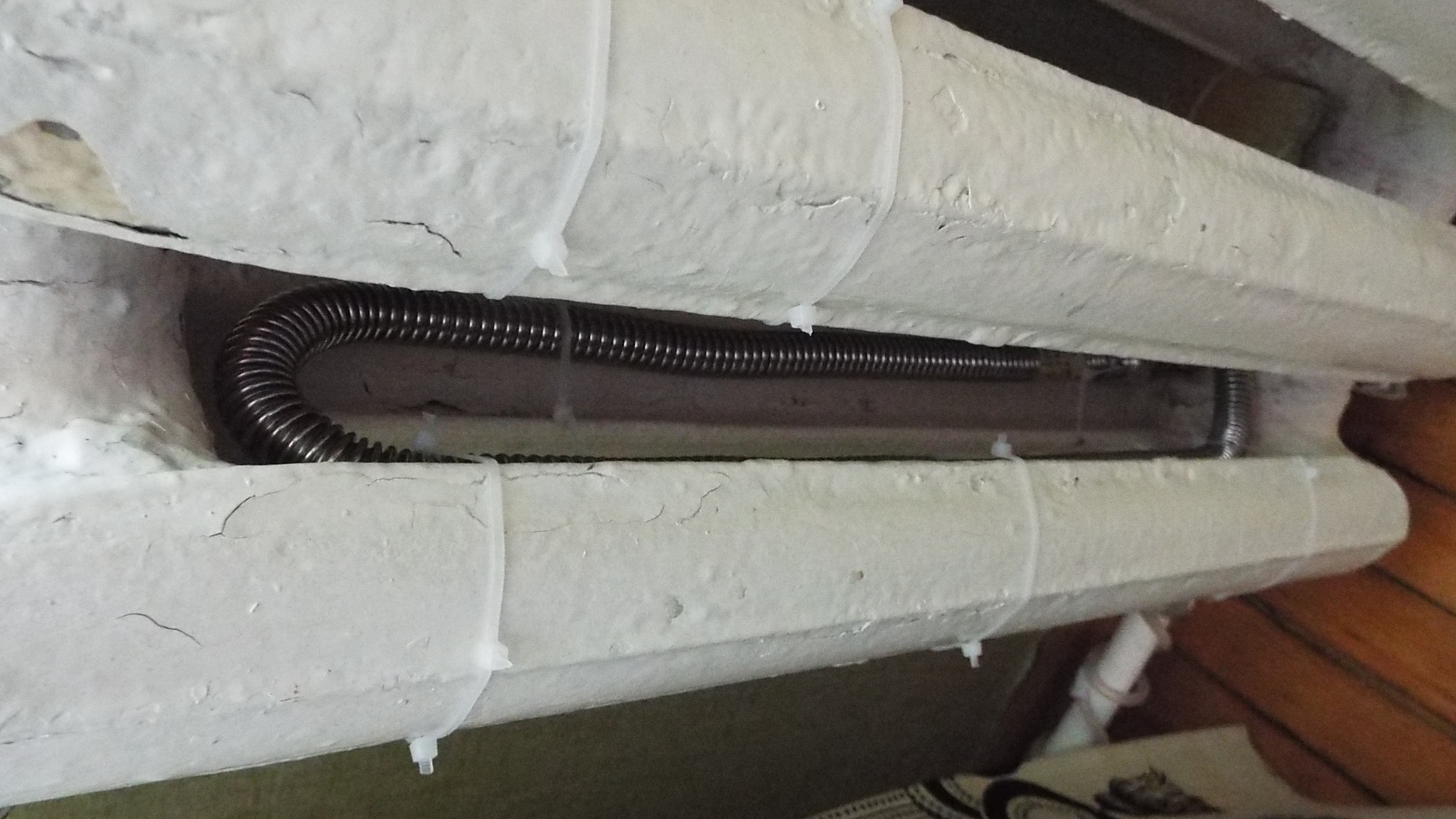 На батарею положена сложенная вдвое двух метровая гофрированная нержавеющая труба (используется для подключения газа - цена 100 гривен). С двух сторон трубы одеты переходники под ёршики. Благодаря очень медленному протоку воды, она успевает нагреваться до 22 градусов при расходе порядка 3-4 капель в секунду (может, ошибся с каплями, вода быстро капают, ещё немного и потечёт струйкой).