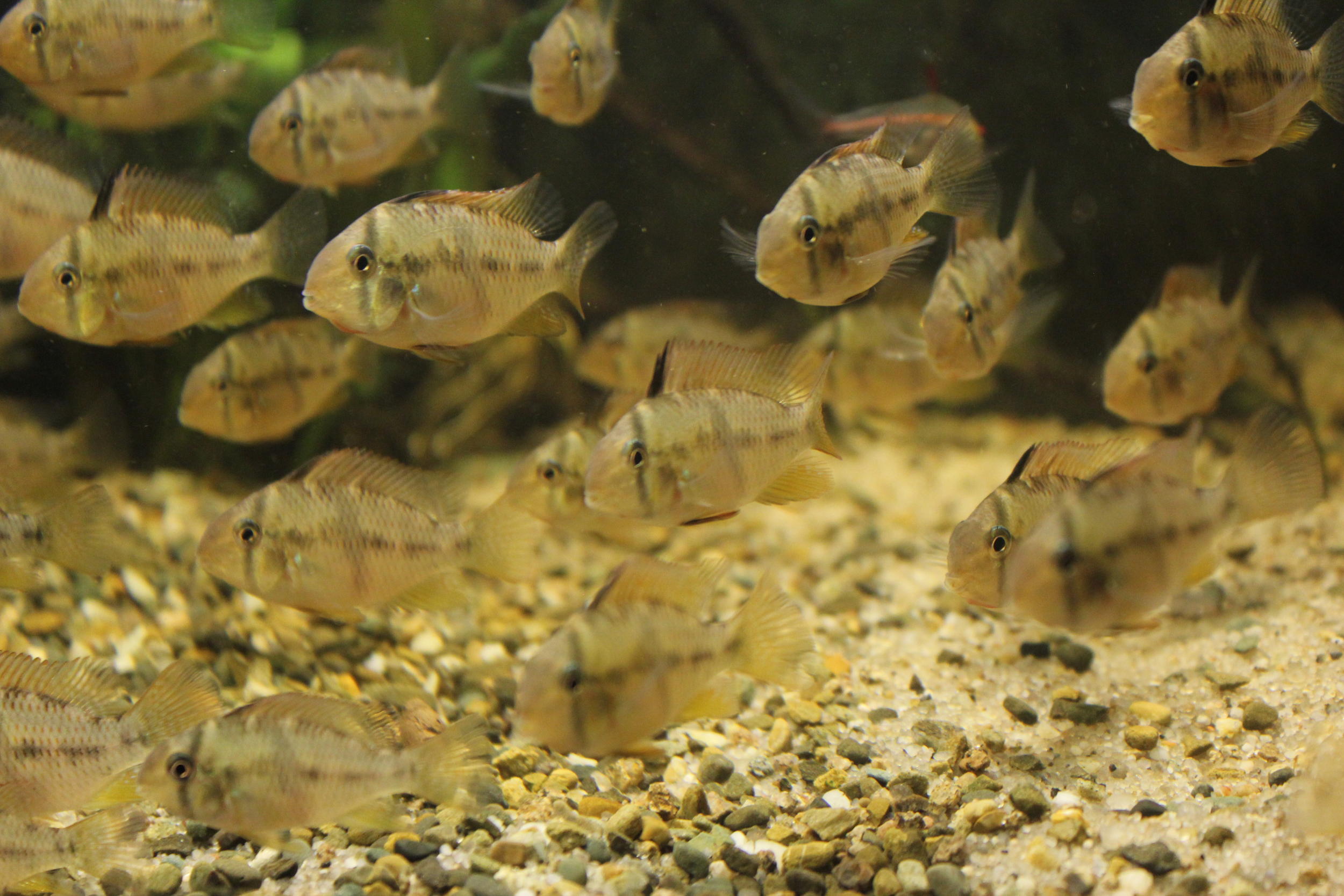 Guianacara owroewefi "Grand Laussat" ореал Южная Америка, бассейны рек Мараньон, Суринам, Сарамакка, Коппенаме. 10-12 см, самка меньше. По центру тела проходт вертикальная черная полоса. рН 6-7,5; dH 5-8; Т 22-25°С