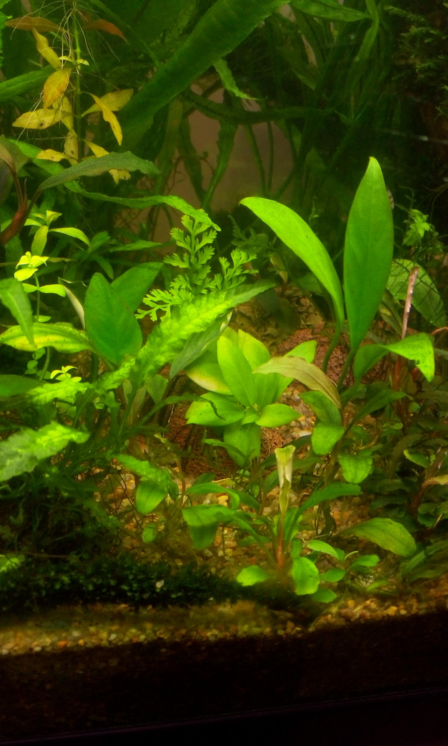 Попал такой ко мне под названием:Anubias barteri var. nana ‘Bonsai’ узколистный, долгое время рос потихоньку в тени эхинодорусов, потом был пересажен в другой аквариум с мягкой водой и нормальным светом и стал вариегатным: