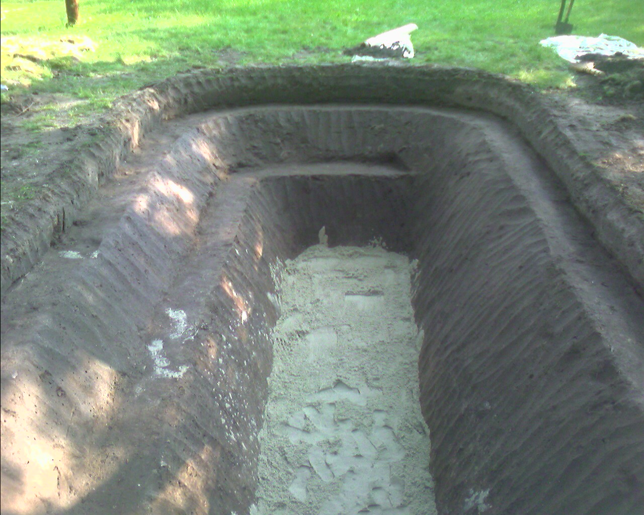 Началась выемка грунта. Изначально посчитав, что нанимать землекопов накладно схватил лопату и… После двух первых кубометров дерна и земли осознал, что деньги – пыль. Тут же на даче сорвал объявление по устройству колодцев и зафрахтовал трех землекопов. Ребята оказались толковые, и под моим чутким руководством, строго соблюдая чертеж, принялись за работу. Пятнадцать кубометров грунта были вынуты за полтора дня, причем могли бы вписаться и в один день, если бы не дождь. Излишки грунта вывозились в посадку на тачке. Обращаю внимание на порядок копки. Если Вы желаете максимально точно соблюсти план, копать следует по горизонтам с отвесными стенками. Первый горизонт 0.25 м. Второй горизонт 0.6 м. Третий горизонт 1.6 м. Скосы под стенки пруда делаются в самом конце. Это правило убережет Вас от отклонения от размеров чертежа.