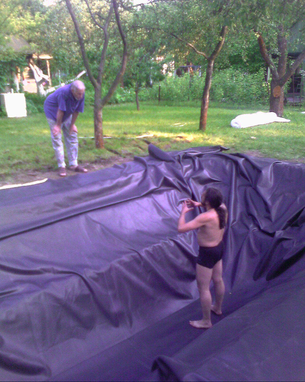 Пришло время пленки. Я выбрал пленку EPDM (этилен пропилен диен мономер). Если выучить название, то можно щеголять своими «знаниями» органической химии. Это самая дорогая пленка. Почему же я выбрал дорогую? Тем более когда бюджет весьма ограничен. Основа чего либо должна быть самая долговечная и надежная! Когда вы ремонтируете двигатель можно поставить дешевые польские поршни. Мало того, они будут прекрасно работать. Но вот вопрос, как долго? И возможно, что в критической ситуации они Вас подведут. Не сомневайтесь! Пленка это основа пруда. Залог его безпроблемности и долголетия. К тому же самая прочная. Мы ведь собрались купаться и ходить по дну! Ладно, хватит лирики. Хочу обратить Ваше внимание на то, что пленка толщиной один миллиметр и размерами 6х9 метров весит более 80 килограмм. Лучше такой кусок стелить втроем или вчетвером. Укладываем пленку. Выбираем все мелкие складки в несколько крупных. Работа не самая трудная, но кропотливая. Все делаем не спеша и с улыбкой. Фиксируем пленку на террасах гладкими камнями или пластиковой посудой (с камнями не гладкими). Проверяем работу, ходим вокруг пруда и фотографируемся.