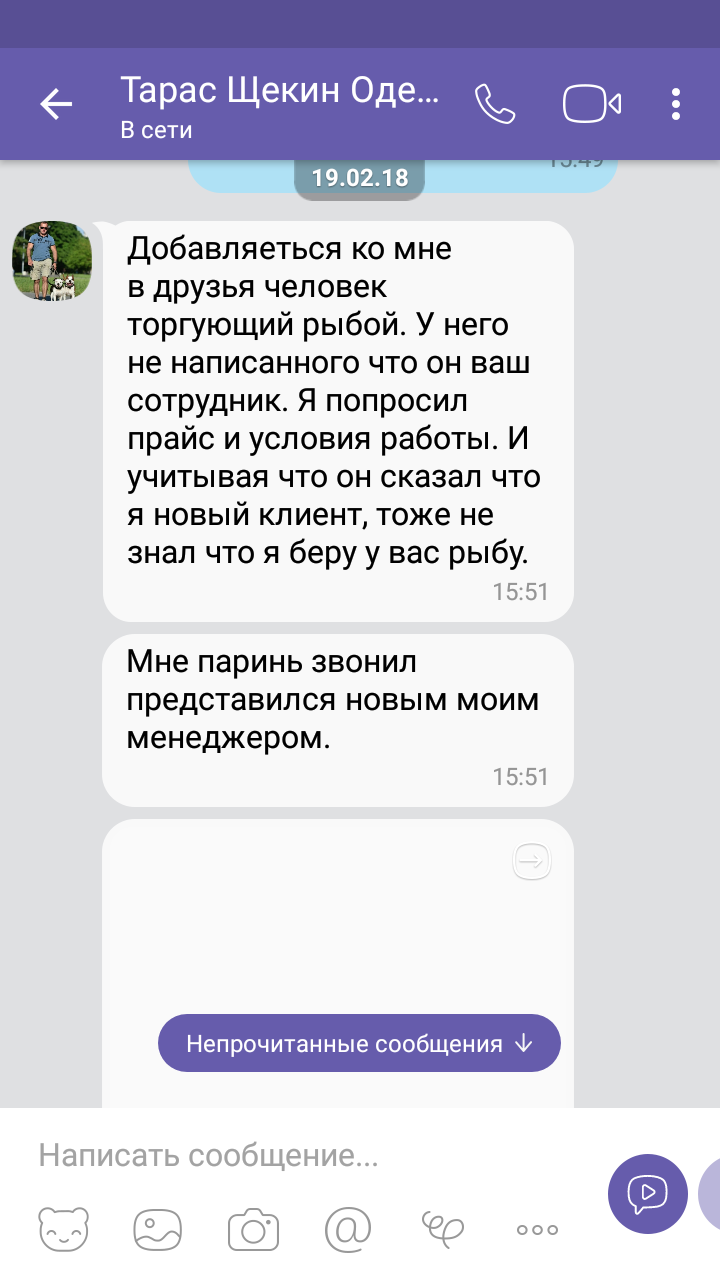 С чего все началось. Поступил заказ на рыбу от нового клиента из Одессы. Не в моих правилах отпускать первую поставку без предоплаты, но до поступления этого заказа за два дня был звонок от уважаемого мною клиента с просьбой помочь коллеге из Одессы. В тот момент я подумал, что речь идет как раз о Тарасе, поэтому отпустил без предоплаты.