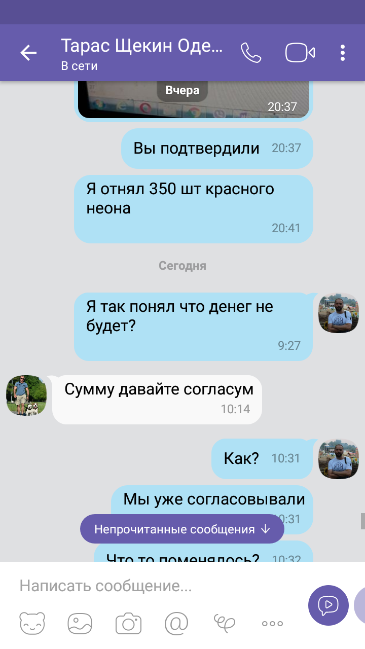 Жду. Звоню. Нет ответа. Опять вайбер. Оказывается, опять сумма не та. Почему-то клиенту привиделось что в накладной вместо 1150 неонов должно быть 800. Да и ладно, я уже сам с себя смеюсь, так развели. Ок. Дайте денег. И тут нет.