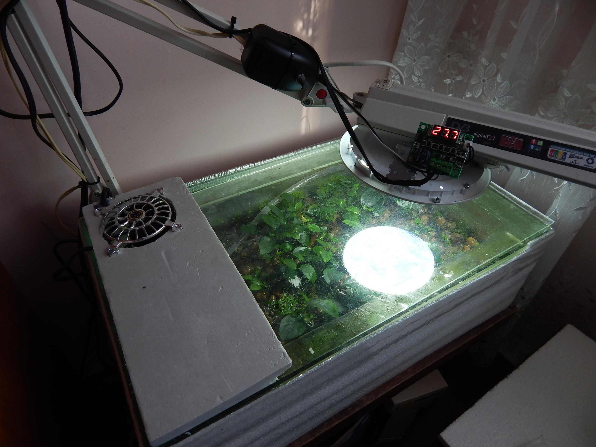 Поставил на тепличку кулер с датчиком температуры для охлаждения , так как растет температура (за +29С) , а пока еще жары нету... Теперь - жара нам не страшна...