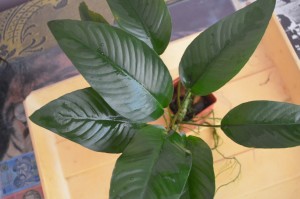 Крупный куст* Anubias «nangi», barteri var. nana x gilletti (R.A. Gasser). Выращен под лампами ЛБ. Хорошо растет в полностью погруженном состоянии. Молодой лист имеет ярко-красную пигментацию. *Первичный материал приобретался в частной коллекции Харькова в 2008 г.