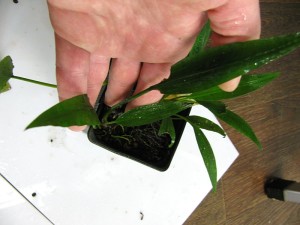 Узколанцетные темно зеленые листья у взрослых растений имею мелкие блестящие точки — звездочки, подобно буфифаландрам. Очень эффектное растение среднего плана, растет как в воде, так и в теплицах (вырастает крупнее).
