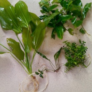 В лот входят: гигрофила компакт — 6 веточек разной величины, несколько веточек хедиотиса Зальцмана, небольшие кустики анубиаса нана и микросорума, почти взрослый куст эхинодоруса — высота около 30см.*Все росло без СО2 и Удо, в водопроводе. Растения без водорослей.