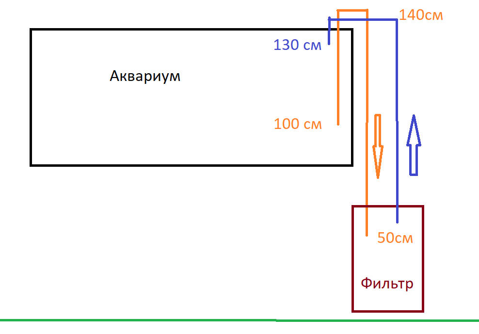 1. Сделать слив и всасывание воды из аквариума как можно ближе к метке 140 см а фильтр установить так что бы уровень головы был на 10 см скажем ниже (другими словами 130 см)?