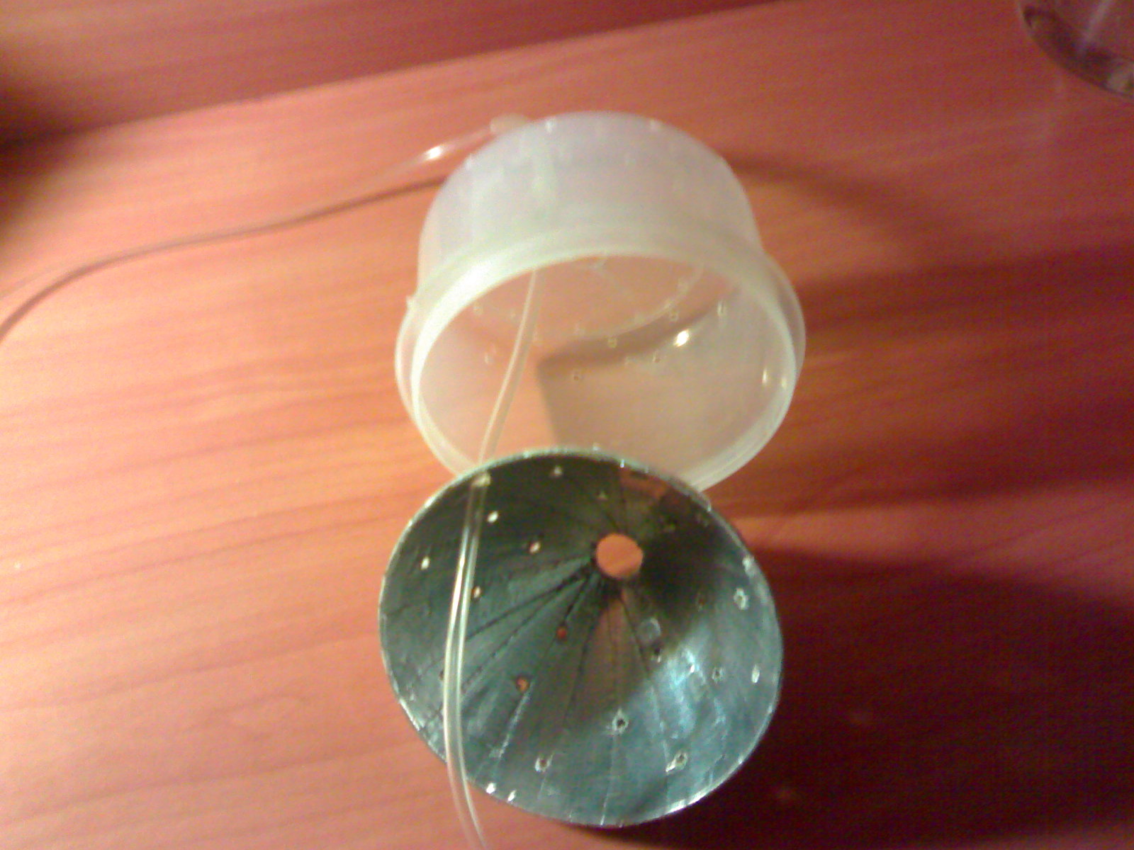 Возникла мысль о полной замкнутости системы, а так как была запланирована аэрация с целью воздухоотвода и с помощью нагретого на конфорке шила были проделаны отверстия в лейке, в контейнере. В тот момент даже не думал, что эти технические дырочку будут иметь замечательный дизайнерский эффект! В одну из этих дырок была просунута трубка аэрации.