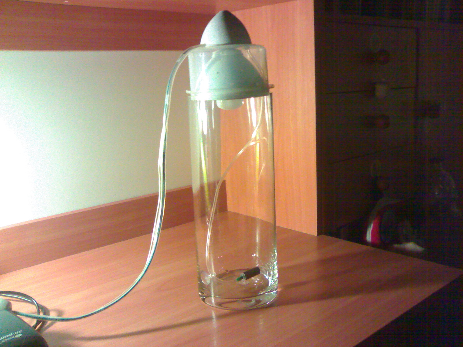 После покупки ваза заняла почетное место наверху книжного шкафа, в виду того, что надо было продумать устройство крышки с освещением, другого оборудования. Обдумывание заняло порядка недели, в результате были сделаны выводы: крышка должна быть легкой для устойчивости, крепиться жестко, иметь отражатель в виду высоты столба воды. Выбор материала был сделан в пользу пластмассы. Вооружившись рулеткой, которой были предварительно замерены диаметры вазы, начались походы по магазинам, супермаркетам в отделы освещения, посуды. В результате был приобретен пластиковый контейнер для продуктов, пластиковая лейка. По размеру контейнер должен был входить в вазу, лейка соответственно в контейнер. Радости и удивлению не было предела, когда контейнер стал в вазу тютелька в тютельку – видимо их делают либо на одном заводе, либо специально под размер друг друга.
