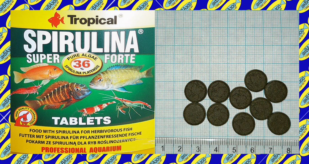Растительный корм в виде самоклеящихся таблеток с большим (36%) содержанием водорослей Spirulina platensis. Предназначен для молодых водорослеядных африканских цихлид и других рыб, в том числе морских, требующих в диете мелкого растительного корма. Водоросли Spirulina platensis возбуждают иммунную систему рыб и положительно влияют на процесс пищеварения. Являются источником ненасыщенных жировых кислот, легко усваиваемого белка, богатого экзогенными аминокислотами, витаминов и микроэлементов, обеспечивающих превосходную кондицию, интенсивный рост и витальность рыб. В результате регулярного применения таблеток окраска рыб, благодаря содержащимся в спирулине каротиноидам, приобретает интенсивность и блеск.