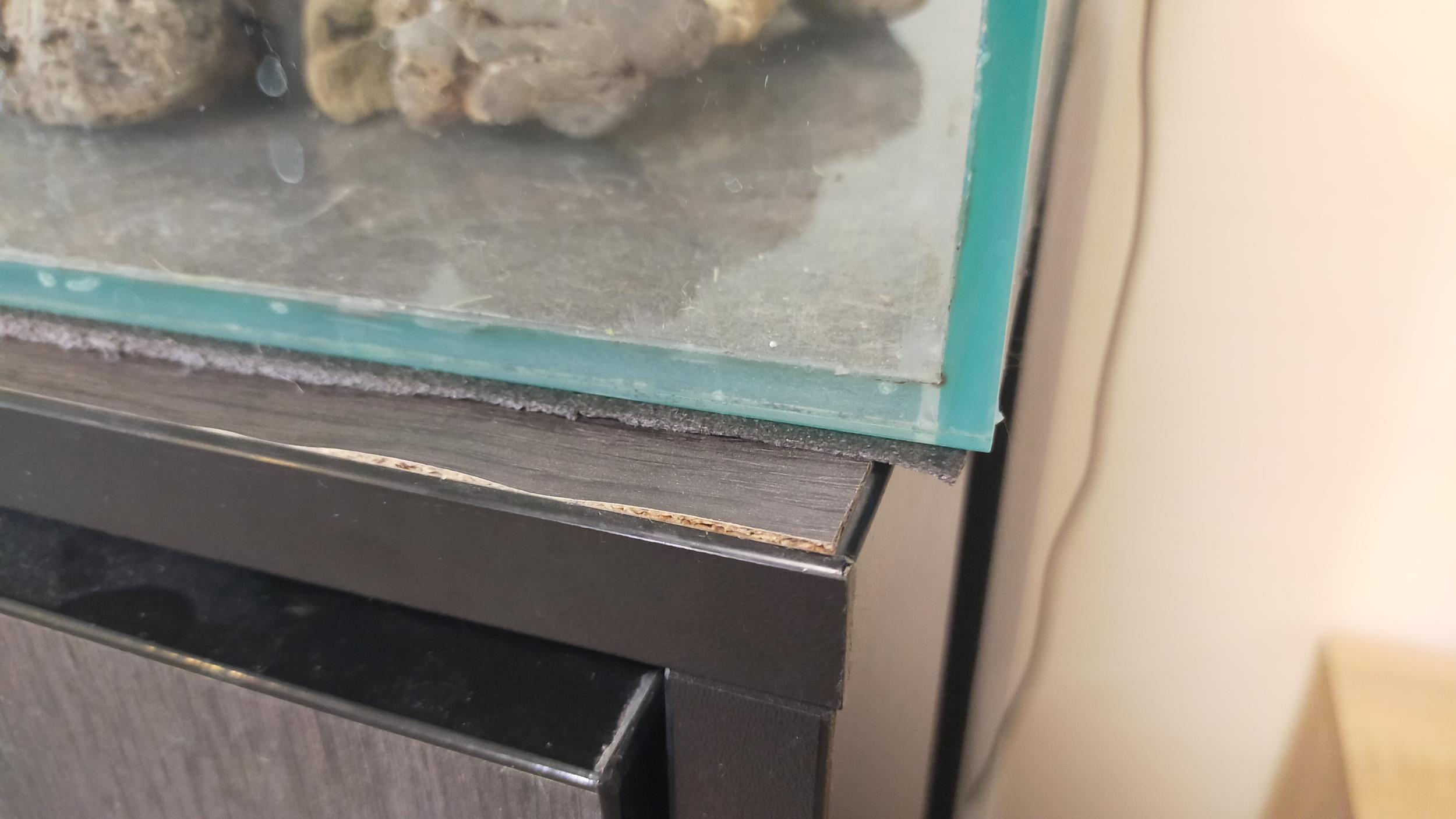 Акваріум+тумба. Акваріум 60*35*35 см. Тумба висотою 77 см. Тумбу додатково укріпив саморізами. Полиця знімається. В тумбу влазить балон на 2 літри. В одному кутку трошки здулась від вологи, але то не критично, коврик під акваріумом це компенсує. Шви акваріума місцями виглядають не дуже гарно, але склеєно надійно. Є кілька дрібних непомітних подряпин на передньому склі. І трохи помітна подряпина на боковій стінці ближче до дна.