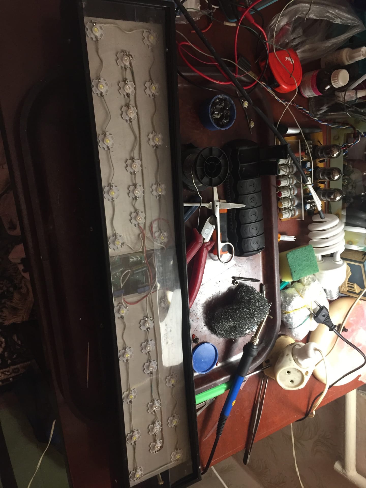 Света еще не было и было решено запустится пока что с прожекторами и походу дела уже думать со светом) поэтому сначала был запуск потом делался свет в течении недели. Как оказалось с алюминием на который можно прилепить диоды у нас оказалось все ну ооочень плохо. И как то раз случайно набрел на радиорынке на пару радиаторов по типу Ёж отлитых судя по всему местными умельцами, но качество было приемлимым и сразу их прибрал к рукам) очень хотелось что б все имело эстетический вид и нужно было обромление для этих радиаторов и под руку попался старый рекламный Лайт-бокс и собственно вот что получилось