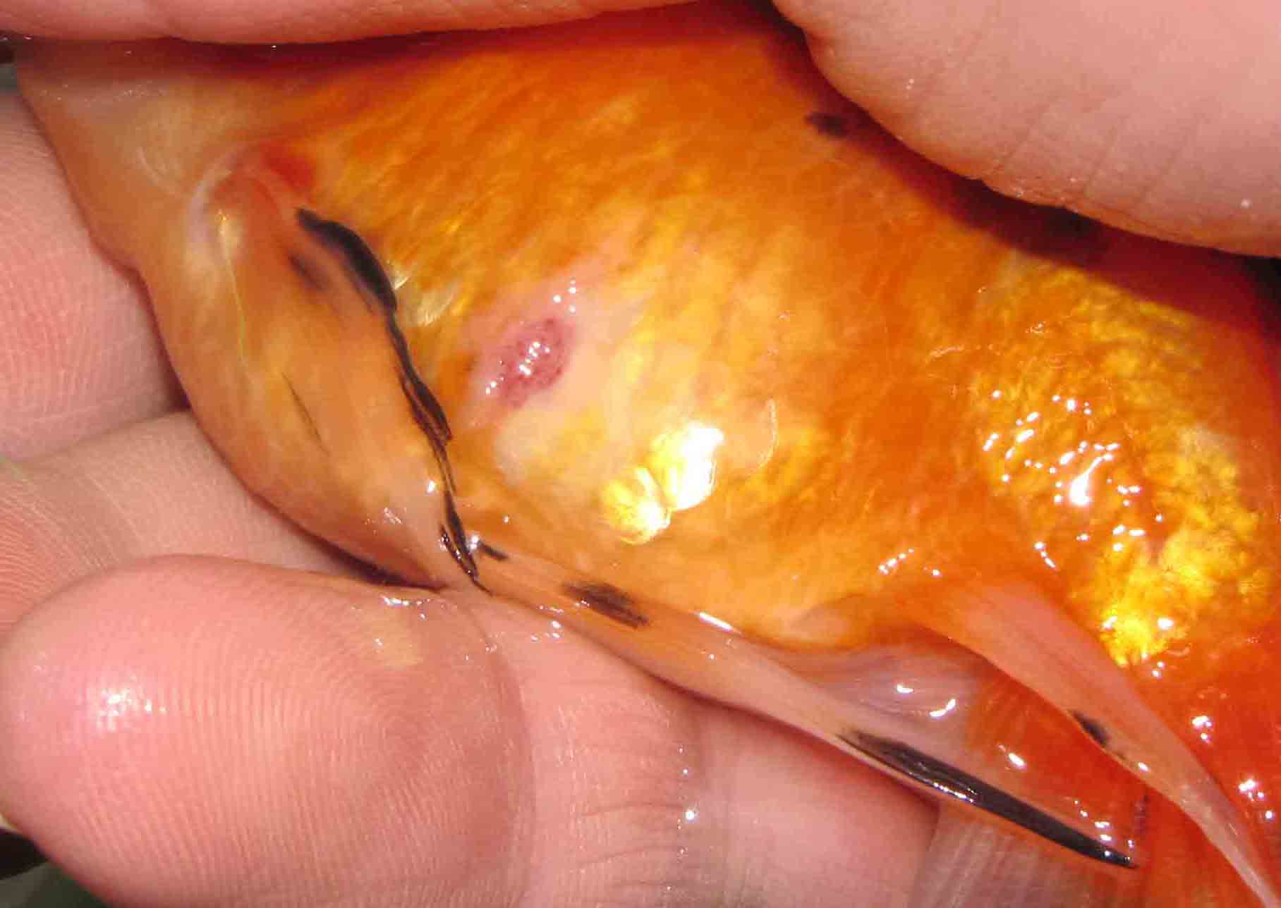 Звязалася зі мною одна пані, в неї проблема. Купила приблизно 20 грудня золоту рибку, і посадила в акву до інших. Десь 30-31 почалося зараження інших рибок. Живою нова рибка була 5-7 днів. Потім здохла тихо опустившись на дно без жодних признаків життя. В інших рибок на 7-8 січня була помічена луска прозорою з дірочкою всередині. Станом на тепер під лускою виділяється слиз із червоним кольором (напевно що кров) виглядає наче видно кусок підшкірної тканини (мяса). Були ще червоні цятки під глоткою, котрі видалялися механічним способом і потім кровоточили. Н аплавниках теж видно розїдання тканини і білі плямки. Рибки активно рухаються і годуються до поки непідуть гайту. Від заражених риб є потомство 2-3 дні приблизно. Порадьте чим лікувати.