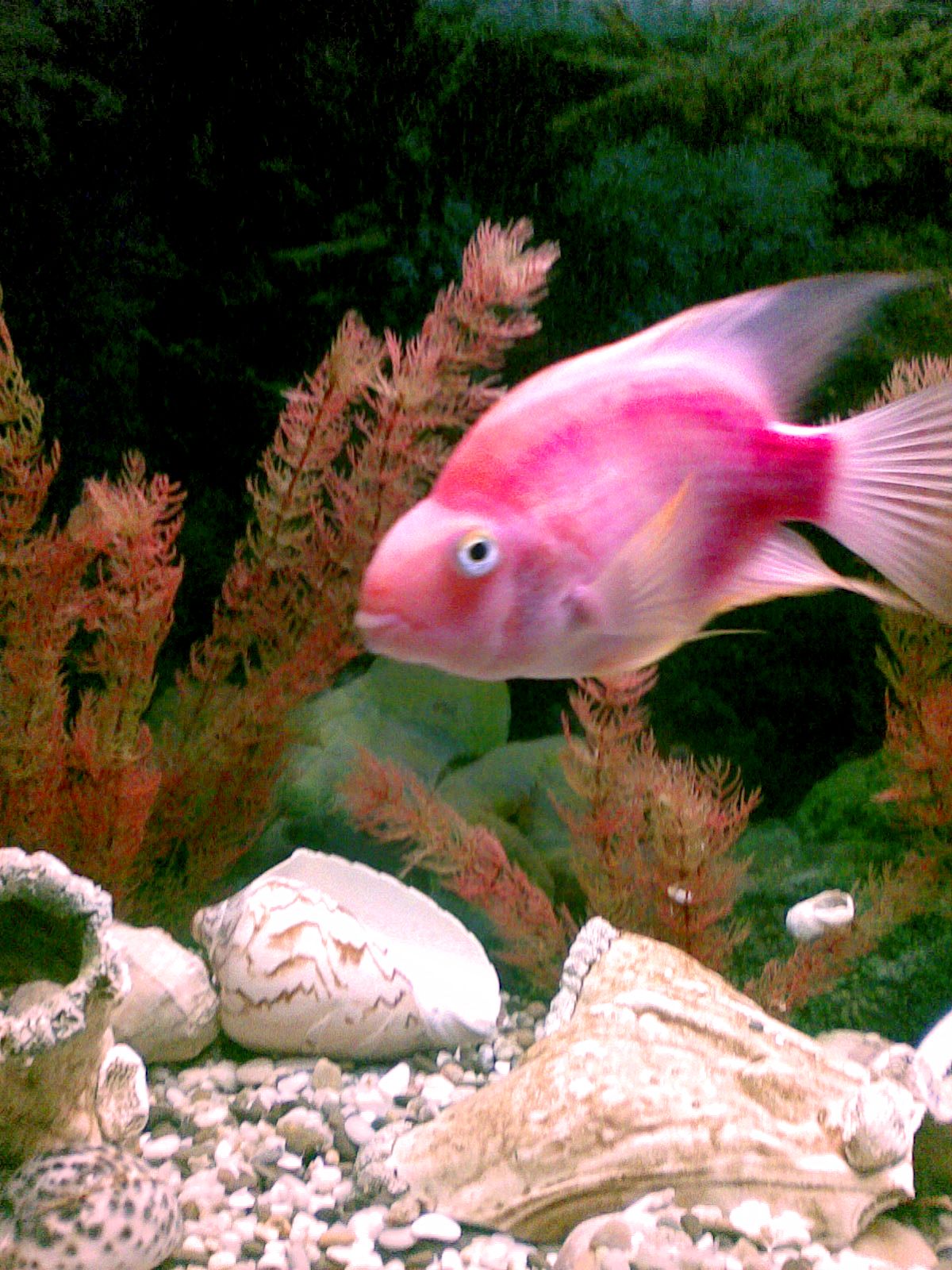 Вот этот аквариум у меня новый всего неделю потому и вода еще мутновата. До этого в 100л. у меня жили эти 2 акулы, 2 попугая, 2 парчовых и все, а в 200л я докупила 3 голубых дельфина. Если присмотритесь там на фотке 2-й попугай сине-зеленый,но очень плохо видно. Извините за качество фотографировала на быструю руку и с телефона. Дельфины посинеют через пару месяцев, а пока они светло голубые.
