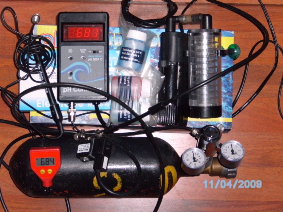 рн контроллер AQUAMEDIC ph2001C + электрод с держателем + электромагнитный клапан + обычный обратный клапан + реактор с помпой + заправленый болон со2 + редуктор давления. Все AQUAMEDIC кроме балона -киевский завод СО2. Хозяйству 1- 1.5 года, электрод менялся 5-7 мес. назад.
