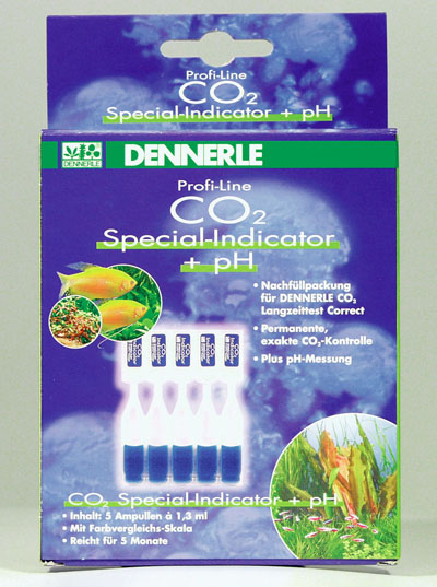 Комплект для полнения Dennerle CO2 Langzeittest Correct. Содержит 5 ампул специальной индикатороной жидкости pH по 1,3 мл., а также шестицветную сравнительную шкалу. Хватает на 5 месяцев.