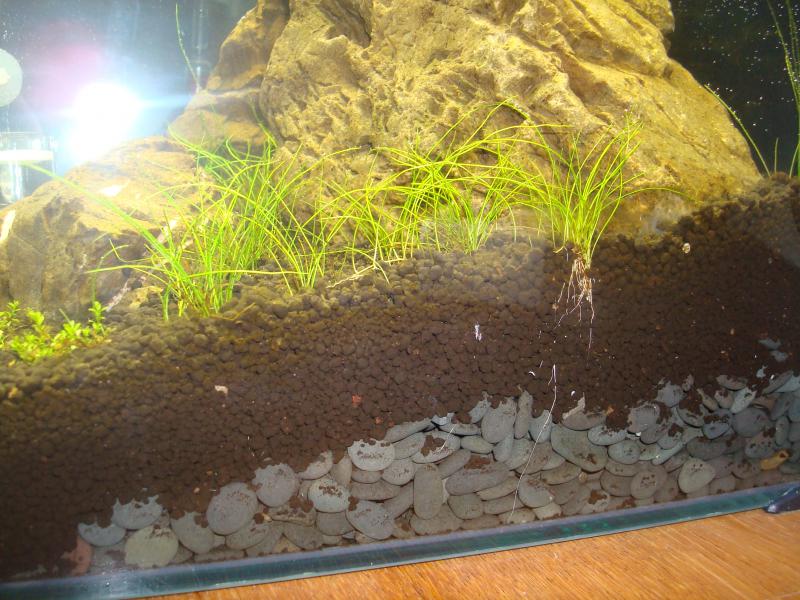 под грунтом мелкий камень, базальт или как там его, не помню (на Павер Сенд секономил, хотя думаю может и стоило было купить). А под большими камнями подложен стиродур, чтобы не раздавить дно.