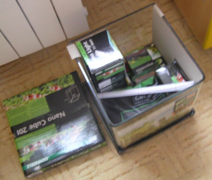 Решил, насобирал денег, заехал в офис коммпании АТГ (официального дистрибьютора торговой марки Dannerle в Украине) и купил. Открывать не решился, всетаки подарок ребенку, а дети очень любят сами срезать заводскую упаковку. Почитал комплектацию на сайте компании - производителя и понял, что от меня требуется только растения, креветки и рыба. Потом оказалось, что еще нужен таймер, но это дело поправимое.