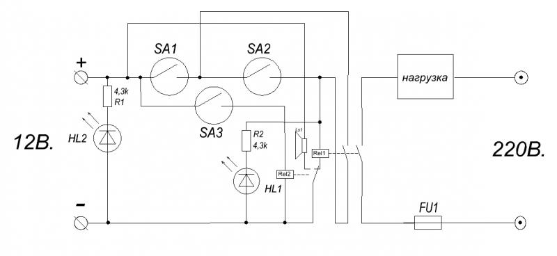 На принципиальной схеме, датчик 1 и 2 отвечают за долив (верхний и нижний уровень) датчик 3 "аварийный" управляет реле 2 и снимает тем самым напряжение с реле 1 и включает зуммер.