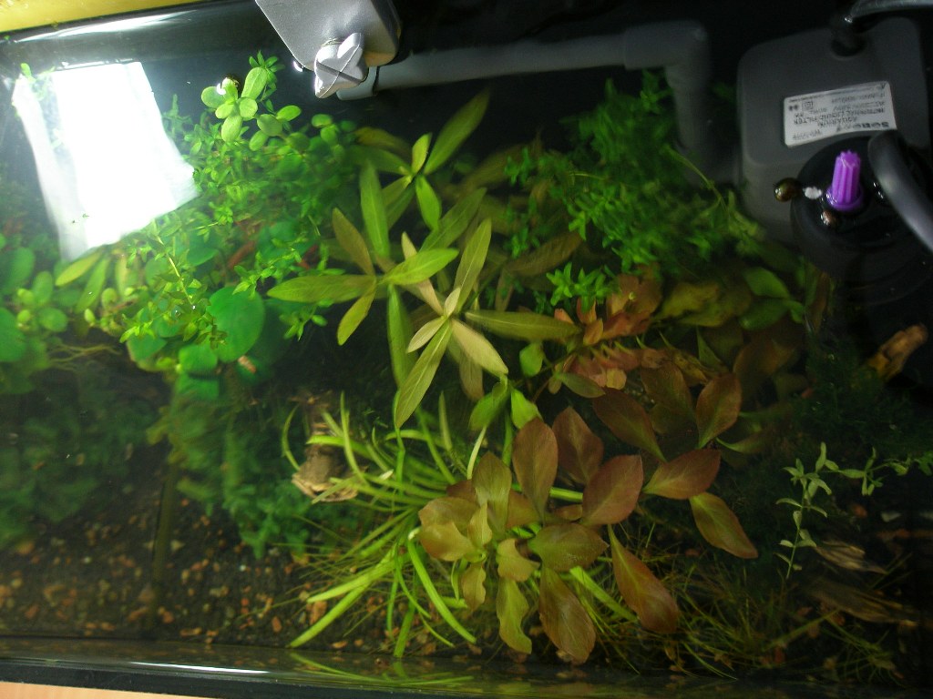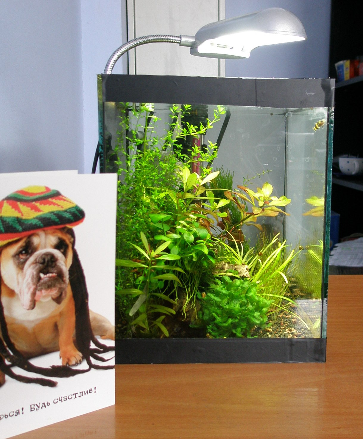 в принципе можно отпраздновать две недельки моего нового проекта. Типа "нано". 12 литров. светильник Jebo 11Вт, грунт колотый базальт 2-3 мм, фильтр внутренний есть, грелка на 50 Вт.