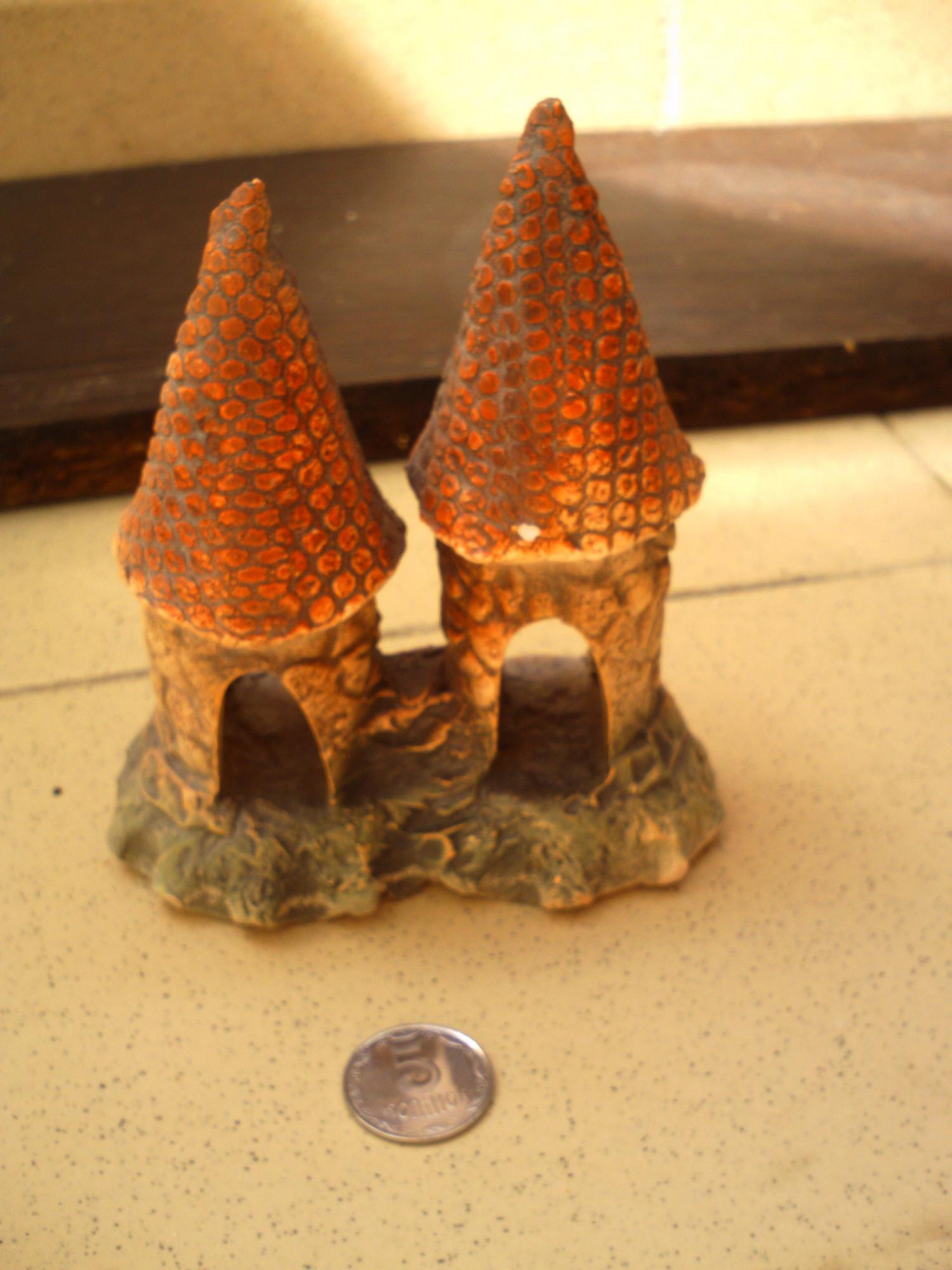 Есть керамическая коряга 1штука, башенки (одна двойная и одна одинарная) и вазон в виде пенька 1 штука.