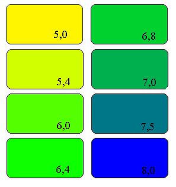 В набор входит вода с кН=4 (200мл) и раствор индикатора рН (5мл). Индикатор рН можно использовать отдельно как тест рН аквариумной воды в диапазоне значений от 5,0 до 8,0. Для определения можно воспользоваться одной из цветовых шкал которых множество в интернете. Либо этой шкалой.