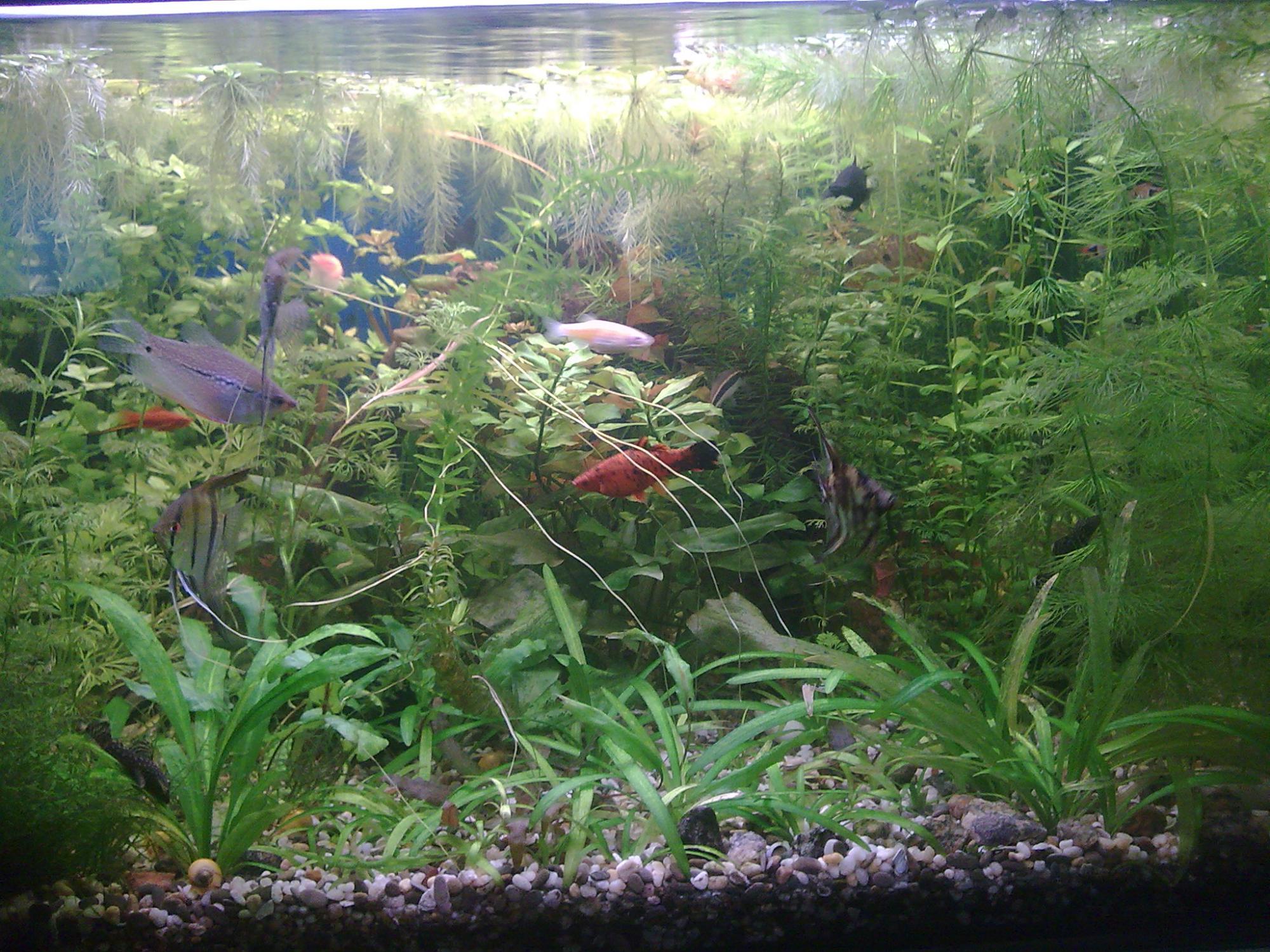 Рыб не перекармливаю,кормлю раз в день артемией мороженой,все сьедается за пару минут.Грунт сифоню только там где кормлю,в других местах затруднительно.Я думал может из-за яркого света и смерху кинул Пистия, (Pistia stratiotes)для того что-бы затемнить,но эфект 0!!!