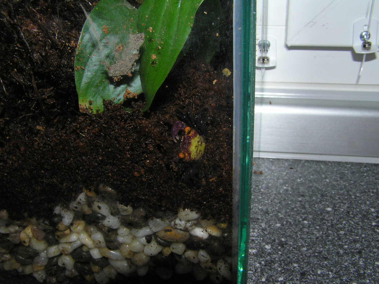 Часто можно встретить рекомендацию устроить в акватеррариуме с крабами настоящий песчаный берег, чтобы животные могли копать норы, чем они в природе обыкновенно и занимаются. На мой взгляд, песчаный берег породит больше проблем, чем решит. И создание его по силам только искушенным умельцам. Нужна система промывки и дренажа, иначе песок быстро пропитается экскрементами крабов и принесет только лишь один вред. Но давайте выясним, зачем радужный краб копает норы? Прежде всего, чтобы находясь далеко от водоема все же иметь доступ к воде и периодически смачивать жабры, которыми он дышит. Нора потому и глубока, чтобы доставать до грунтовых вод. В условиях акватеррариума таковой необходимости не возникает. Вода всегда рядом и крабы проводят в ней немало времени, причем в воде они питаются активнее. Вторая функция норы – это укрытие с подходящим влажным микроклиматом. Укрытий в акватеррариуме с крабами должно быть много, причем не только надводных, но и подводных. Агрессивность животных друг к другу снизится если они будут иметь возможность периодически прятаться, а не все время маячить на глазах друг у друга. В качестве укрытий могут использоваться различные гроты и пещерки, битые цветочные горшки, керамические трубки, коряги. Камни могут высоко возвышаться над водой. Крабы с удовольствием залезают на самые их вершины, так, чтобы можно было греться под теплом лампы. Однако, не надо ставить камни так, чтобы они позволяли подобраться слишком близко к источнику тепла, поскольку перегрев чреват преждевременными линьками. Если положить руку на такую правильно расположеную площадку для загорания, то можно будет почувствовать только очень слабое тепло. В противном случае надо будет подобрать камешек пониже. Кроме того, часть суши должна находиться в прохладе вдали от источников тепла
