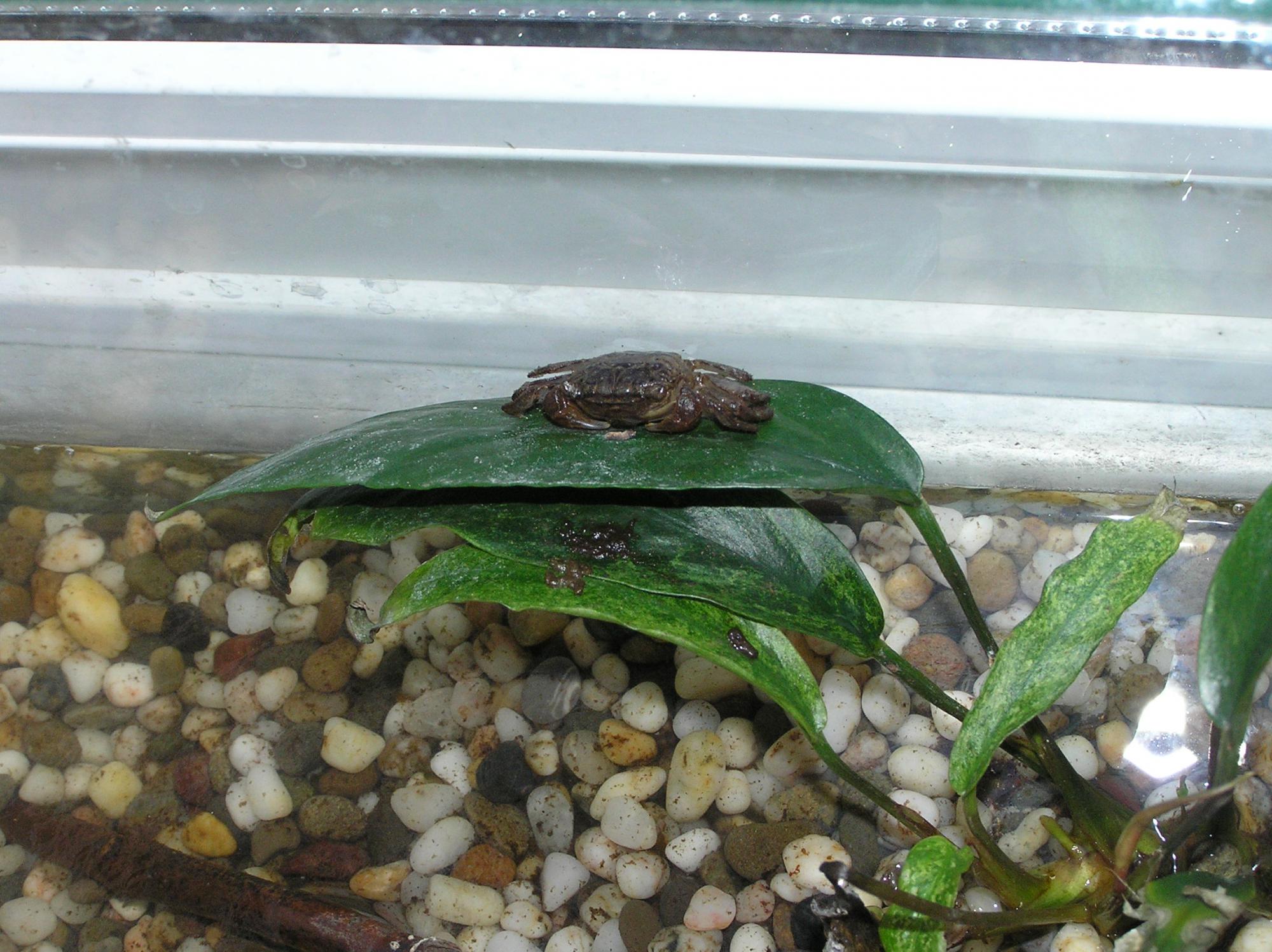 О линьке следует особо сказать несколько слов. Все ракообразные, и крабы в их числе, заключены в жесткий панцирь и увеличиваться в размерах могут только во время относительно коротких периодов времени после того, как они сбросят старый тесный хитиновый покров и окажутся в новом, еще не затвердевшем. Процесс линьки – это самое тяжелое испытание в жизни крабов, раков и креветок. В природе он тонко регулируется на гормональном уровне. Влияет на приближение срока очередной линьки температурный режим, характер питания и, по-видимому, продолжительность и интенсивность освещения. К линьке животное должно подойти не испытывая недостатка в витаминах и располагая достаточным запасом пластических и минеральных веществ. И уж, тем более, оно не должно быть отравлено продуктами жизнедеятельности, накопленными в воде акватеррариума. Линьки происходят только в воде. По понятным причинам, аквариумисту удается обеспечить выполнение всех этих условий далеко не всегда. Особенно это касается новичков в аквариумном хобби, которые покупают яркого и забавного, почти игрушечного крабика, совершенно не задумываясь о том, что игрушка-то это живая, и адаптирована она к жизни в природе в таких условиях, которые сымитировать дома совсем не просто. Далее одной линьки у них обычно дело не идет... Как правило, крабы, да и другие ракообразные в неволе погибают именно во время линьки.