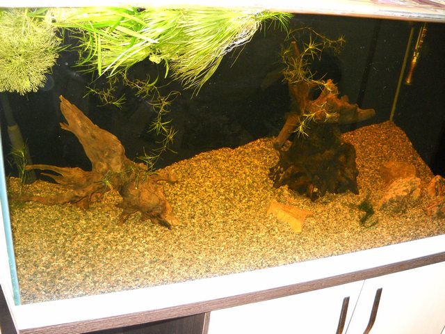 Сверху на питательный грунт выложил слоем от 3 см (спереди) до 15 см ( у задней стенки). Сформировал холмы, расставил камни и коряги. Получилось так... Не совсем то...