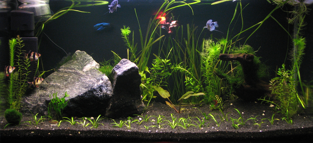 Здраствуйте, ну баночка уже запущена, но травки явно не хватает. Рыбы пока простые: Лабио-2, гурами мраморные-2, петухи-2, барбусы-3, ампулярий штук так 5 и креветки неокардины штук 10 (размножаются, сложно посчитать).