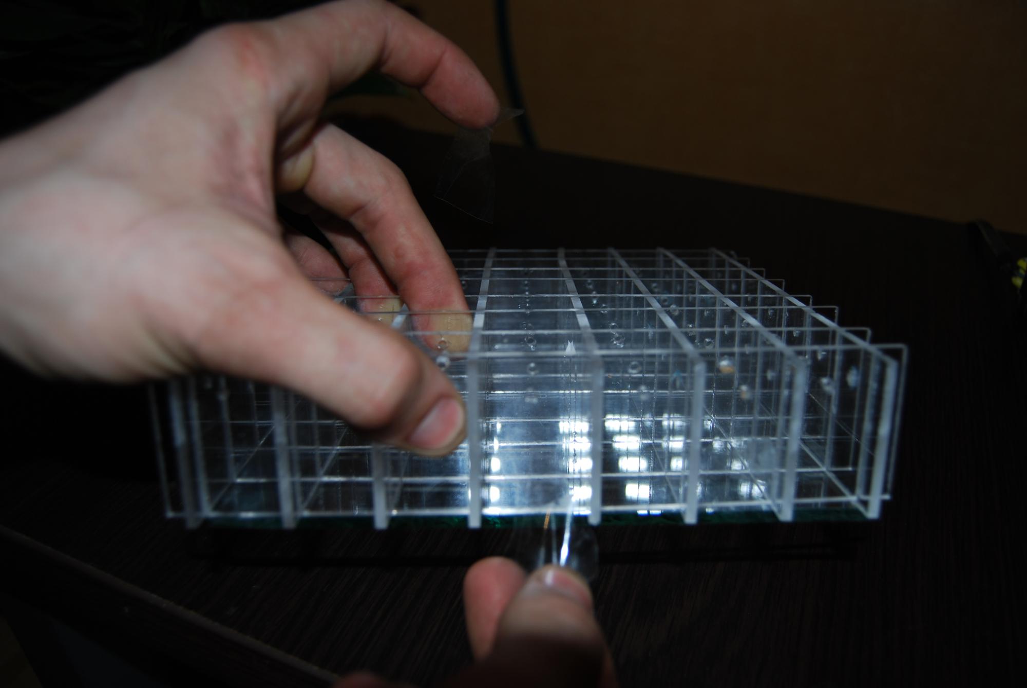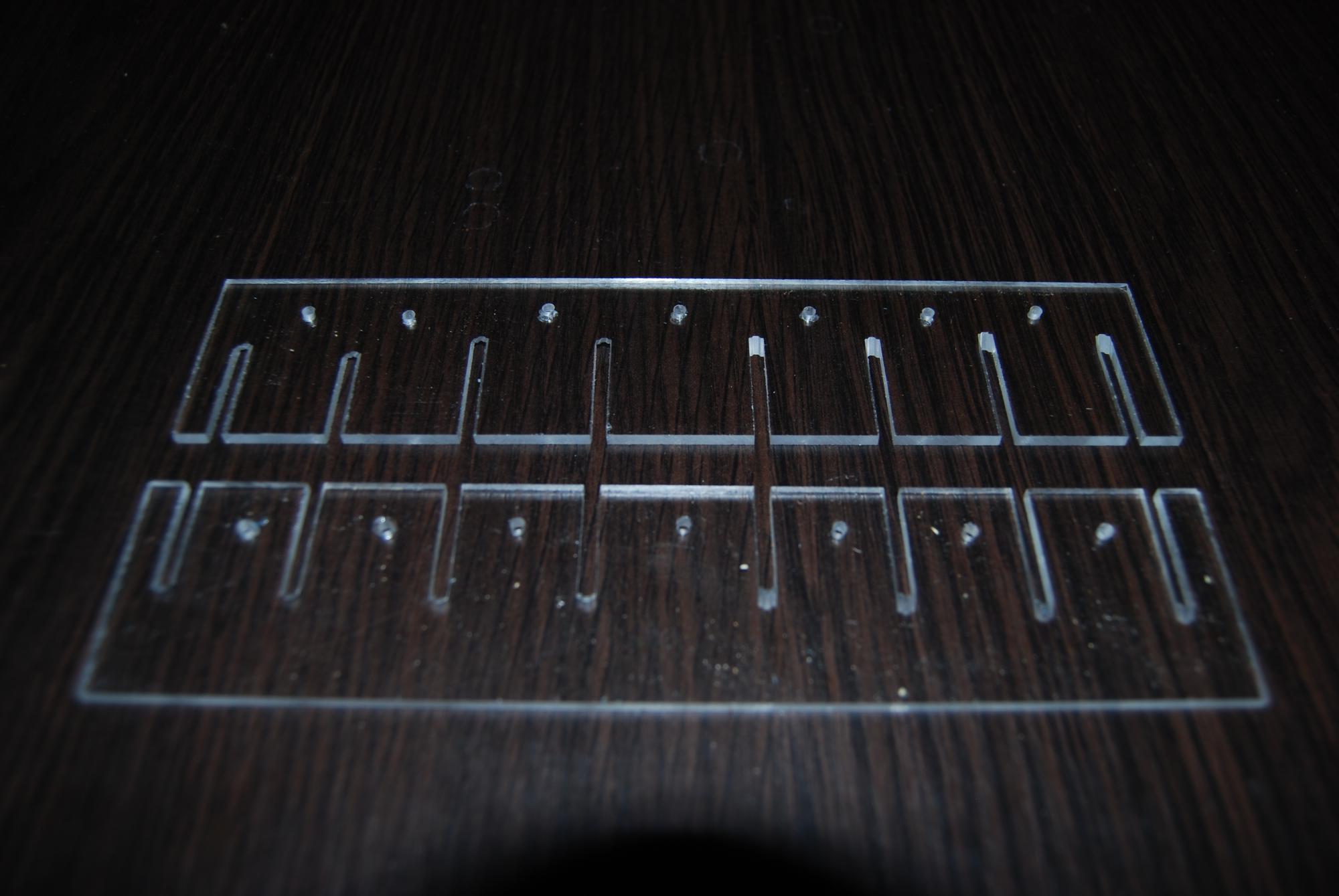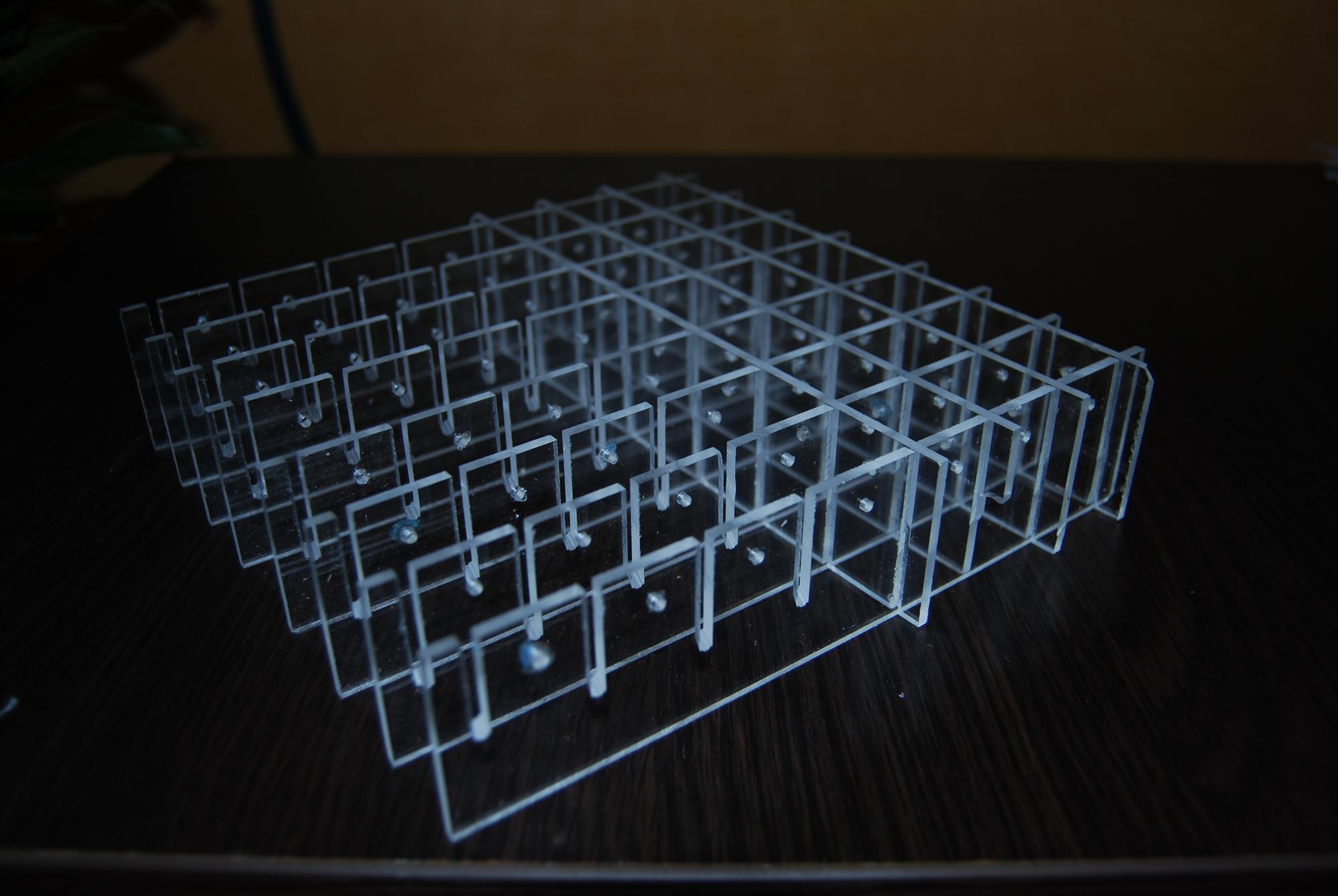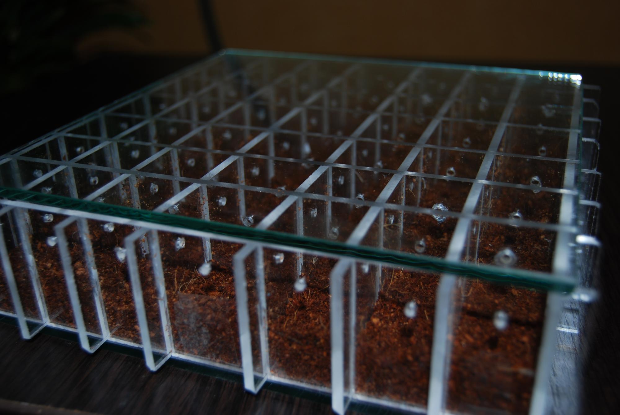 И так.После спаривания моих брах,самка сплела кокон,с которого вышло около 200маленьких обжорливых зверушек.И стал вопрос,куда их всех порассаживать.По началу держал всех скопом,потом начал заселять в отдельные баночки.НО,сколько ж места они все займут.Вот и стал выдумывать велосипед.Вот что вышло.У меня в остатках были полосы акрила толщиной 3мм и шириной 40мм.Я их нарезал на планки 200 на 40мм.и зарезал на церкулярке таким образом как на фото 1 и засверлил в них отверстия для вентиляции сверлом в 2мм.Затем,сложил эти детали в одну конструкцию(фото 2).Сборка заняла минут 5.Каждая ячейка вышла 2.5 на 2.5см.Вырезал 2 стекла 18.5 на 18.5(эти размеры взяты по крайним точкам конструкции).Стёкла использовал для днища и крышки.К днищу конструкцию прикрепил скотчем,по 3 полоски с каждой стороны(фото 3).теперь днище закреплено к конструкции.Засыпаем субстрат и заселяем малышню))))),и накрываем крышкой.Крышку можно использовать как днище второго этажа такой же конструкции.Данная общага мне нравится тем,что её можно разобрать и собрать в любой момент.и в собраном виде она занимает мало места.Как вам????