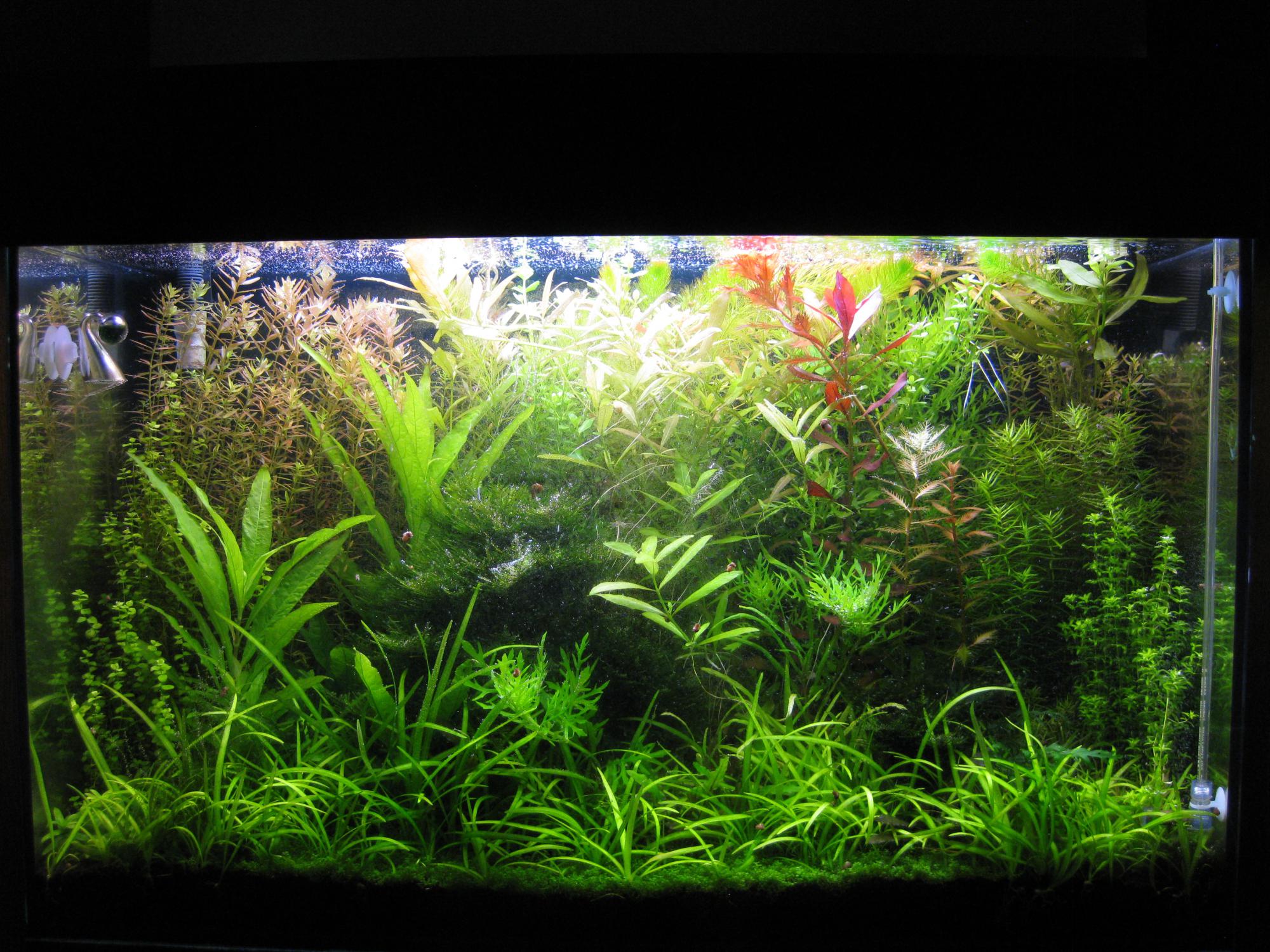 Сейчас банке три месяца и она меня реально радует. Все процессы автоматизированы (свет, удо, СО2). Я только подмениваю воду, правда не всегда получается раз в неделю по графику, бывают сбои (раз в 10-14 дней). При этом, что меня очень радует, водорослей нет, разве что зелёные на переднем стекле, да и то, их количество, думаю, научился контролировать количеством подаваемого железа. Заросла банка конечно, но стричь буду позже и кардинально. Сейчас наблюдаю интереснейшую картину захвата растениями пространства. Конкуренция однако,выживает сильнейший. Обратите внимание на два куста слева Гигрофилы иволи...., я думал иволистной, но там листья-лопухи 20-25 см длинной. Я уже и не знаю что это за монстр. ))))