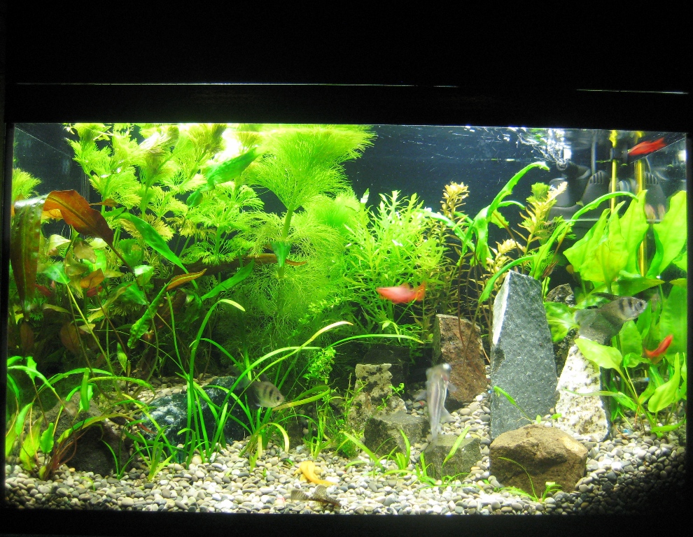Теперь руки добрались и до аквы. Мои 50л. Вчера был перезапуск после 5-ти летнего простоя. В нём только поддерживалась жизнь рыбам, растючка вся погибла как и большинство рыб, остались только 4 рыбки.