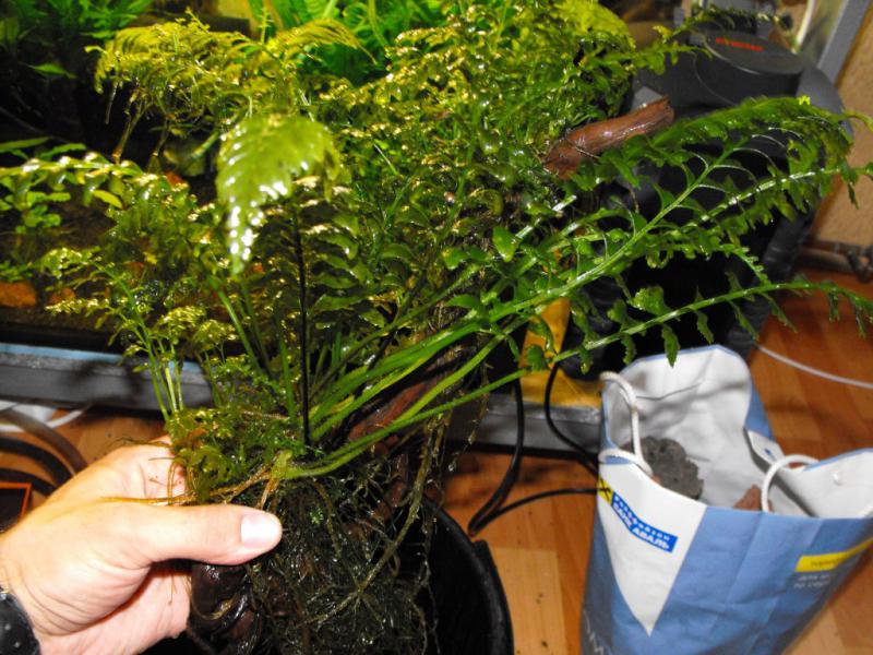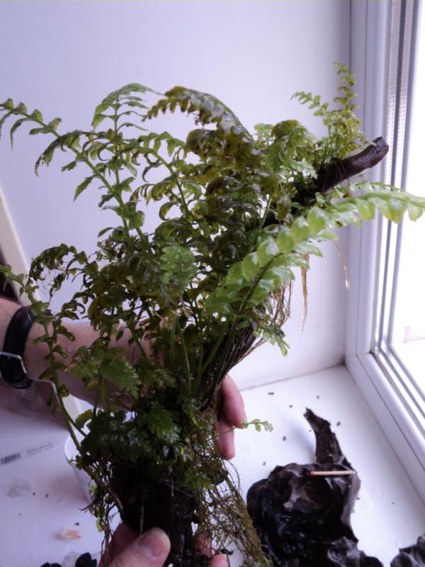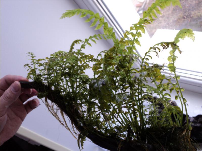 По моим наблюдениям, в субмерсе папоротник растёт несколько быстрее, чем в палюдариуме, но не любит яркого освещения. Что бы быстро получить деток, достаточно слегка надломить сформировашийся лист. Примечателен этот папоротник ещё и тем, что детки иногда самостоятельно образуются на ризомах.