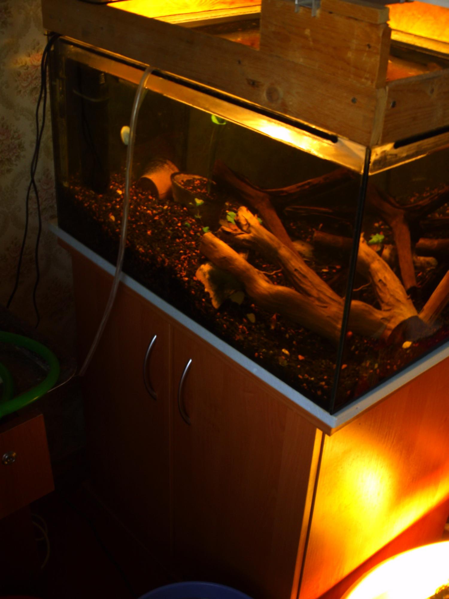 Крышки акваса – самодельная деревянная  . Плафон – накрылся, посему стоит энергосберегалка.