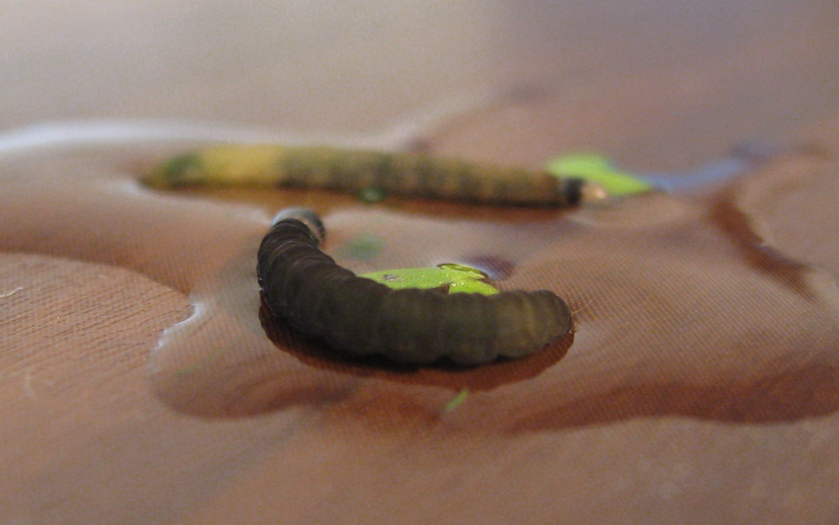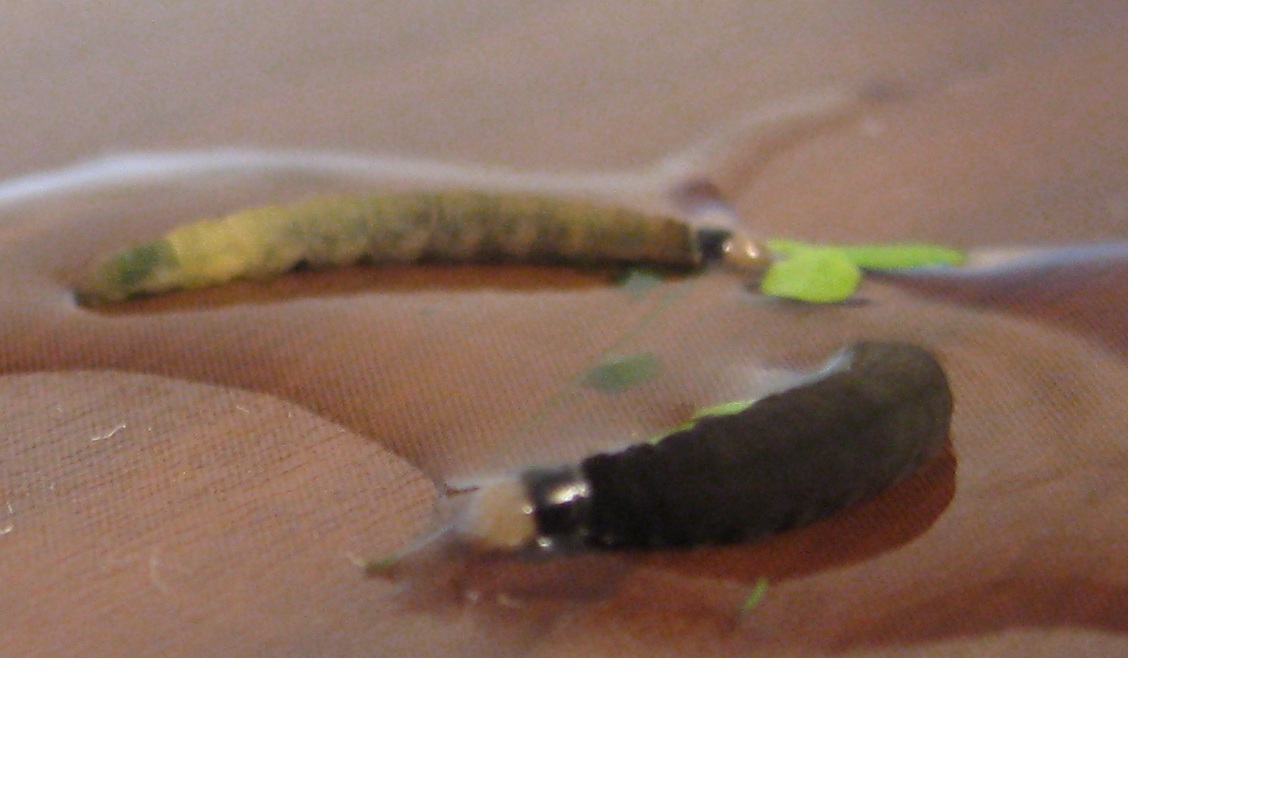 Смотрю, кто-то обгадил всю акву зелененьким. Выглядывала- выглядывала, так и не поняла, но сыпалось с самой поверхности. Потом присмотрелась, а на поверхности из риччии и ряски понаделывали себе коканы какие-то гусеницы. Очень прошу опознать, может они не опасны и пусть уже вылупляются себе на здоровье?...Создания, как видно на фото, могут быть как коричневого, так и бежевого цвета. Длина 11 мм +/-. Диаметр 1 мм.