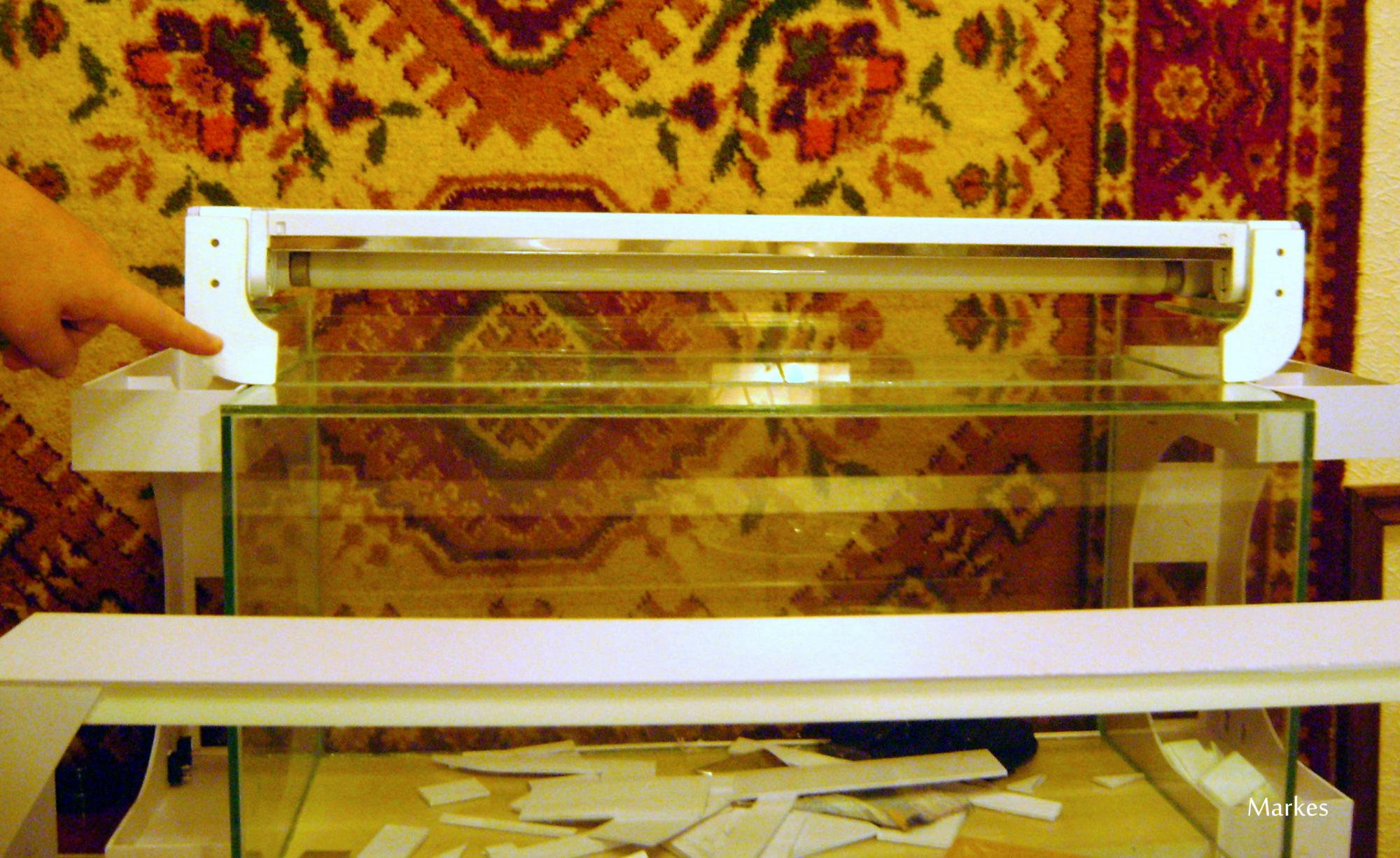 Аквариум стоит большей своей частью на подставке из ДСП (две трети дна) и плюс подставка в виде дуги ( по самой "выпуклой" точке на 3 см не доходит до переднего края) Так что большая часть все -таки надежно установлена. Уверен, не "кувыркнется". Сомнения в двух передних углах.