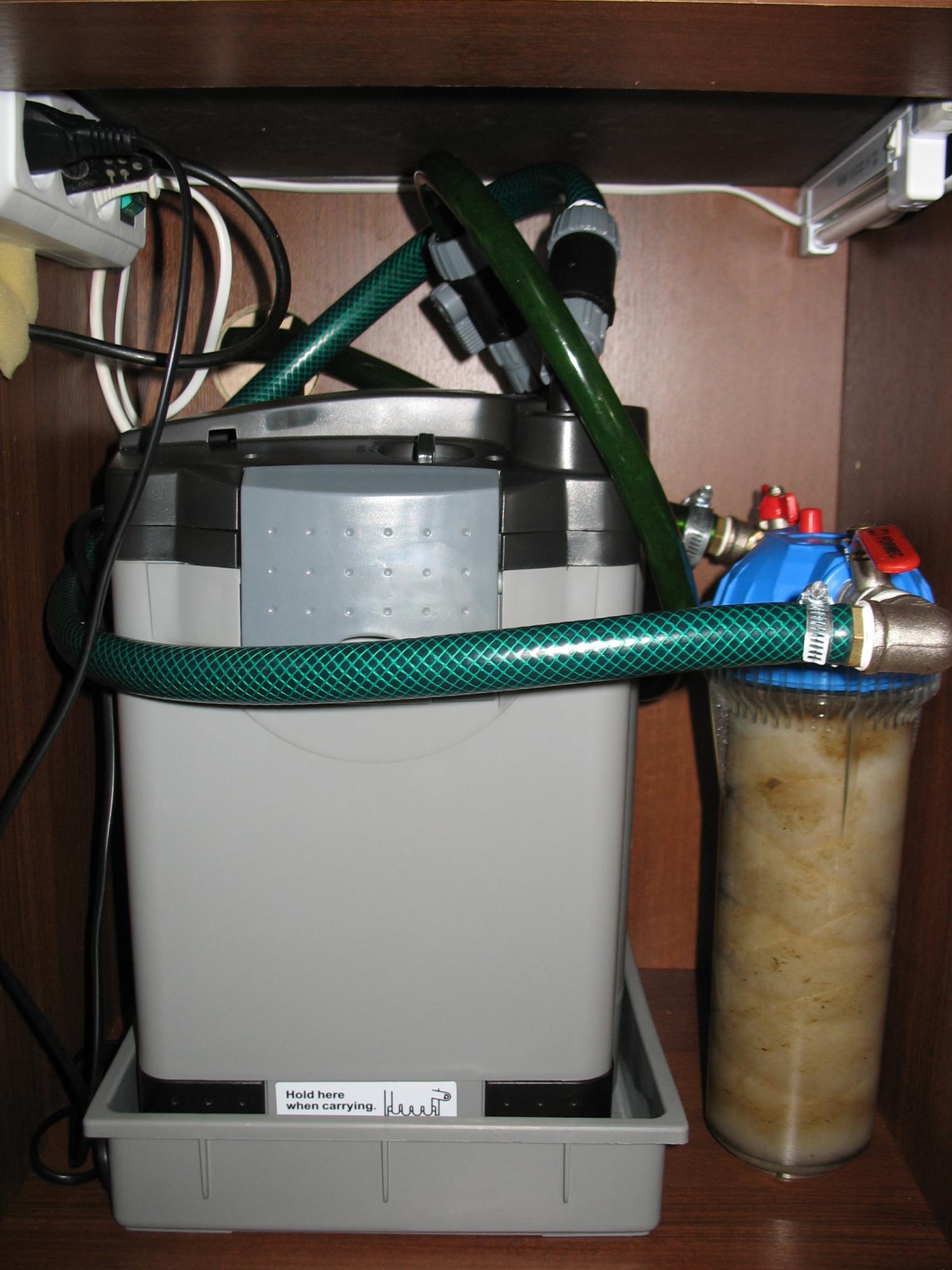 Есть фильтр Jebo 815, с помпой в 1000л\ч, чистых получается где то 500л\ч если не меньше. Т.к. можно сказать фильтр слабоват для такого аквариума, то чистить его придется чаще, чтобы этого избежать сделал предфильтр из колбы для водопроводного фильтра.